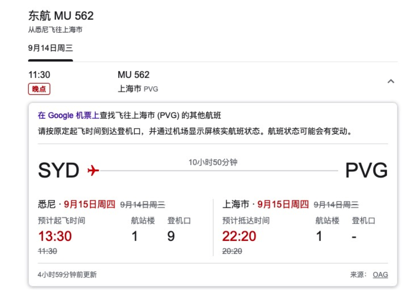 悉尼飞上海的MU562航班延迟起飞,