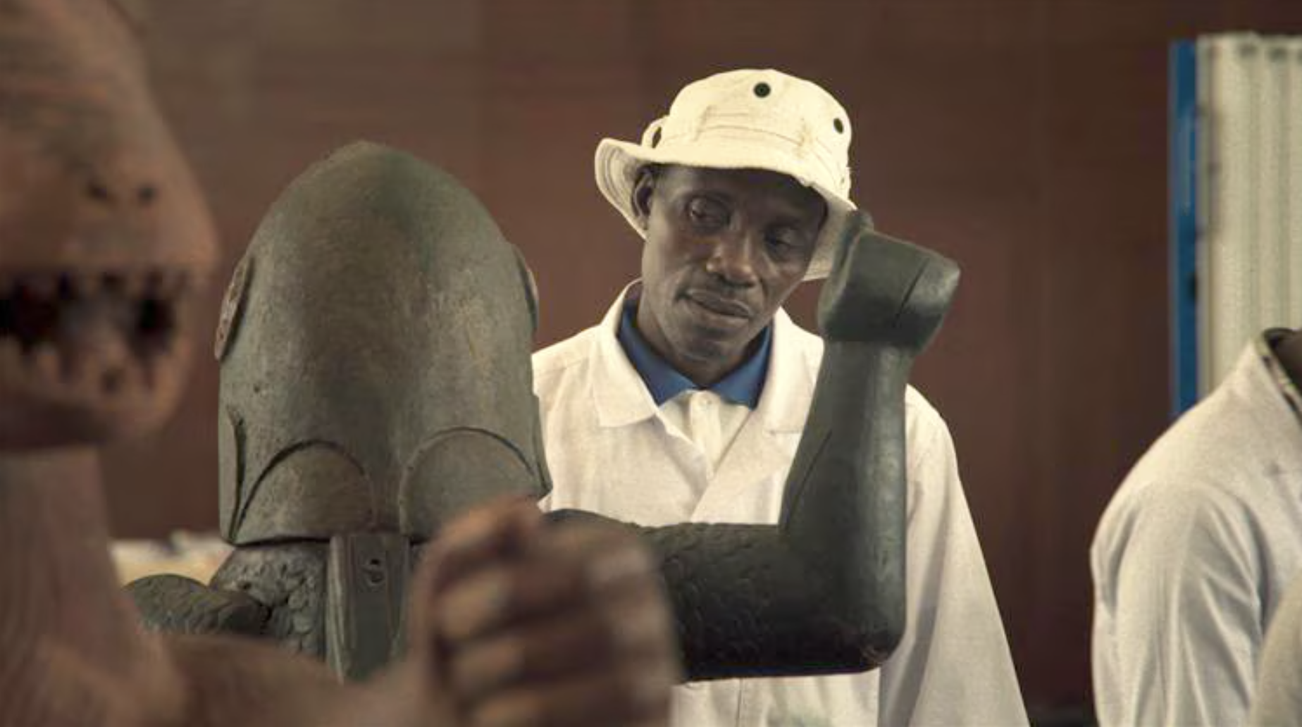 马蒂·迪奥普的纪录片《达荷美》早期的字幕显示,这些文物是“皇家珍宝”,是 1892 年法国殖民者入侵达荷美王国时从那里偷走的。它们是木制和青铜制品,象征着军事力量和对历史统治者的复杂描绘。