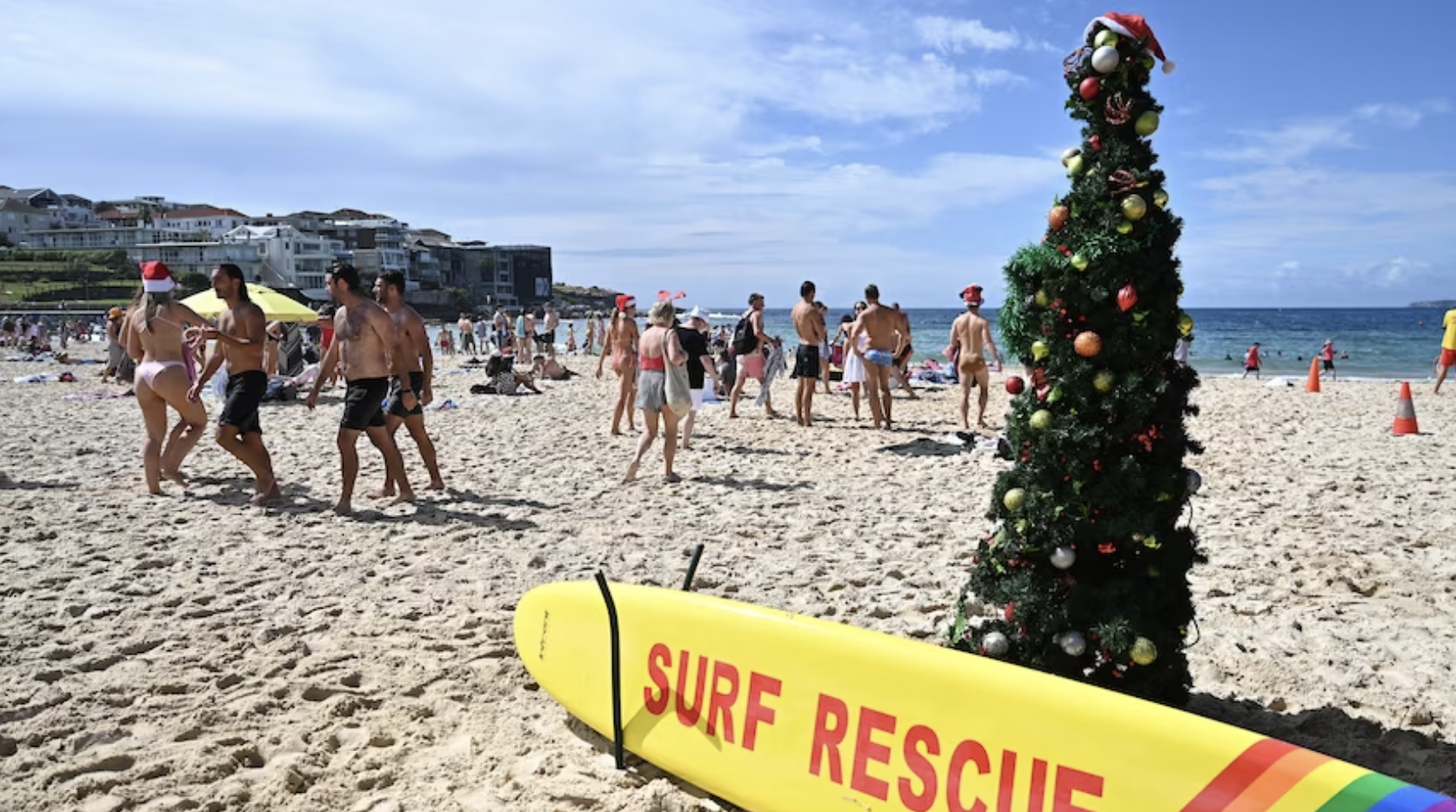 在邦迪,沙滩上布满了红色的圣诞老人帽子,成千上万的人涌向澳大利亚最著名的海滩庆祝“澳大利亚方式”。