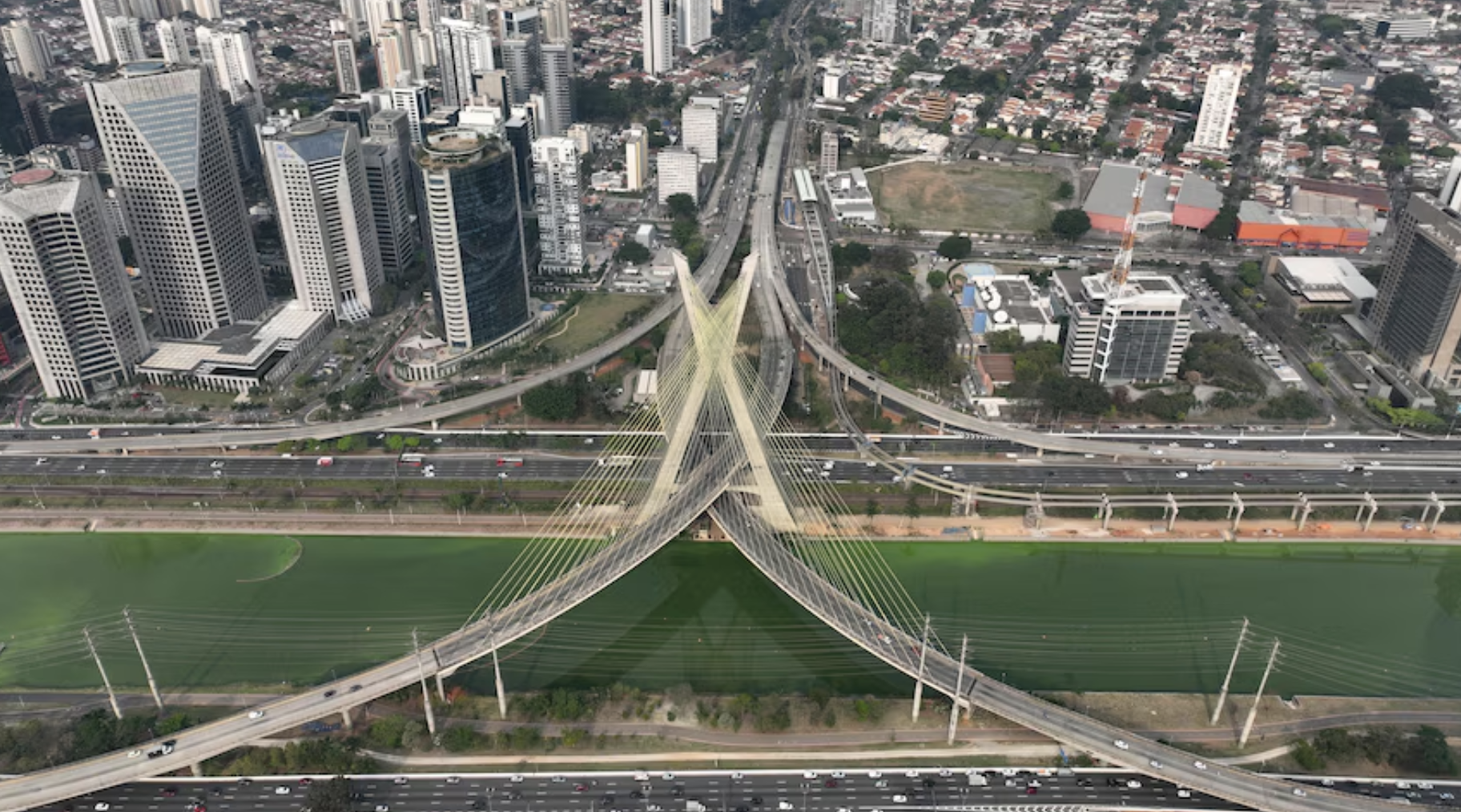 巴西大都市圣保罗的一条主要河流变成了翠绿色,城市上空被橙灰色的烟雾笼罩。