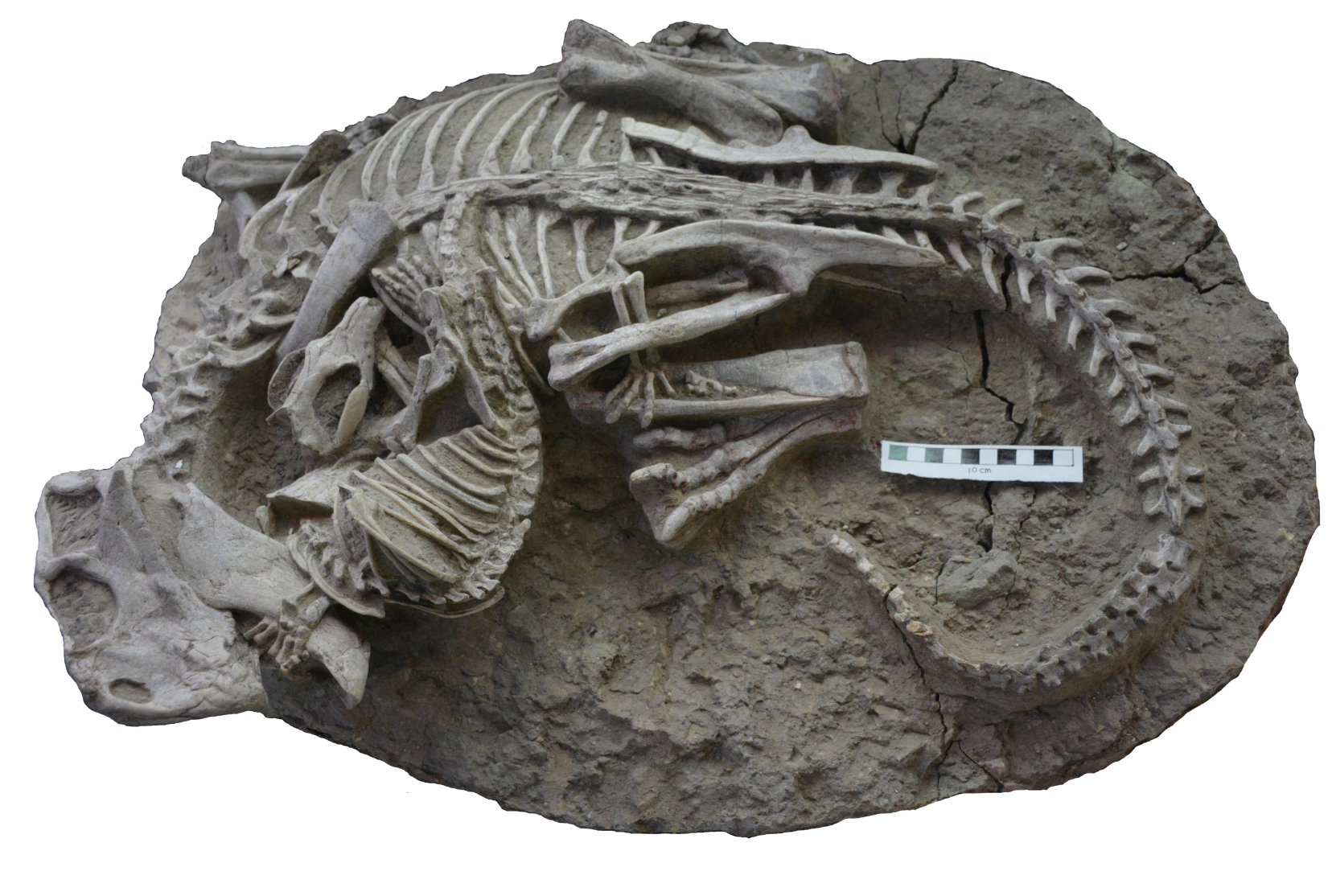 该化石显示,一种类似獾的生物正在咀嚼一只小型喙状恐龙,它们的骨骼纠缠在一起。
