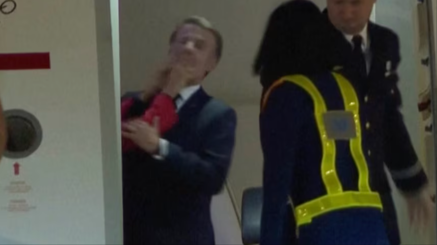 在视频中,当地时间周日晚些时候,马克龙女士在丈夫走下总统专机之前推了他一把,导致他后退几步,随后才恢复过来,并向下面停机坪上的摄像机挥手致意。