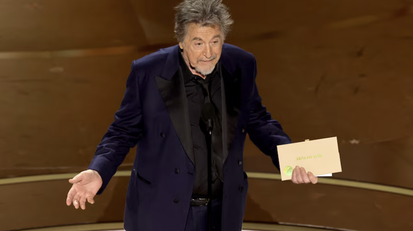 当帕西诺打开信封公布获胜者时,他说:“我的眼睛看到了奥本海默”,没有提及其他任何事情。